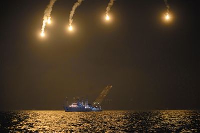 22日,搜救人員在照明彈的光亮下連夜搜救。
