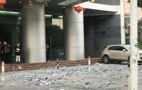 在無錫一大樓下,狂風(fēng)掃過后一地的碎石塊。