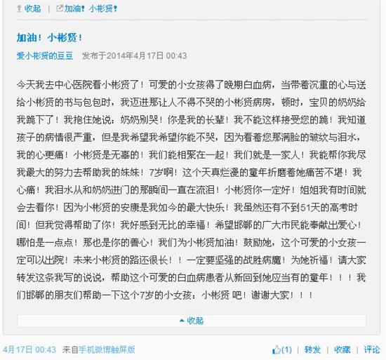 “愛小彬賢的豆豆”是女孩的微博名稱,她寫了一段話私信了邯鄲之窗微博,她記錄了看望小彬嫻的整個(gè)心理動態(tài),她希望用自己的方式給予小妹妹精神上的支持與幫助,她愛小彬嫻,所以她會一直在小彬嫻身邊。