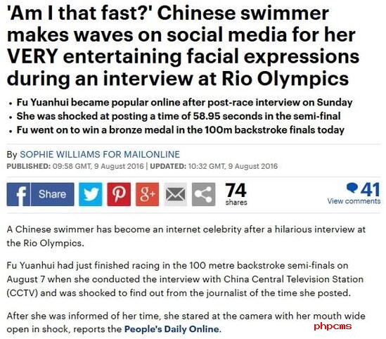 而對于傅園慧的搞笑采訪,《每日郵報》也做了簡單的介紹,但是對于傅園慧那句極具中國特色的“我已經(jīng)用了洪荒之力了!”《每日郵報》的翻譯非常普通,相對于博大精深的中文表達,英國媒體顯然已經(jīng)找不到合適的語句來翻譯傅園慧的“洪荒之力”。