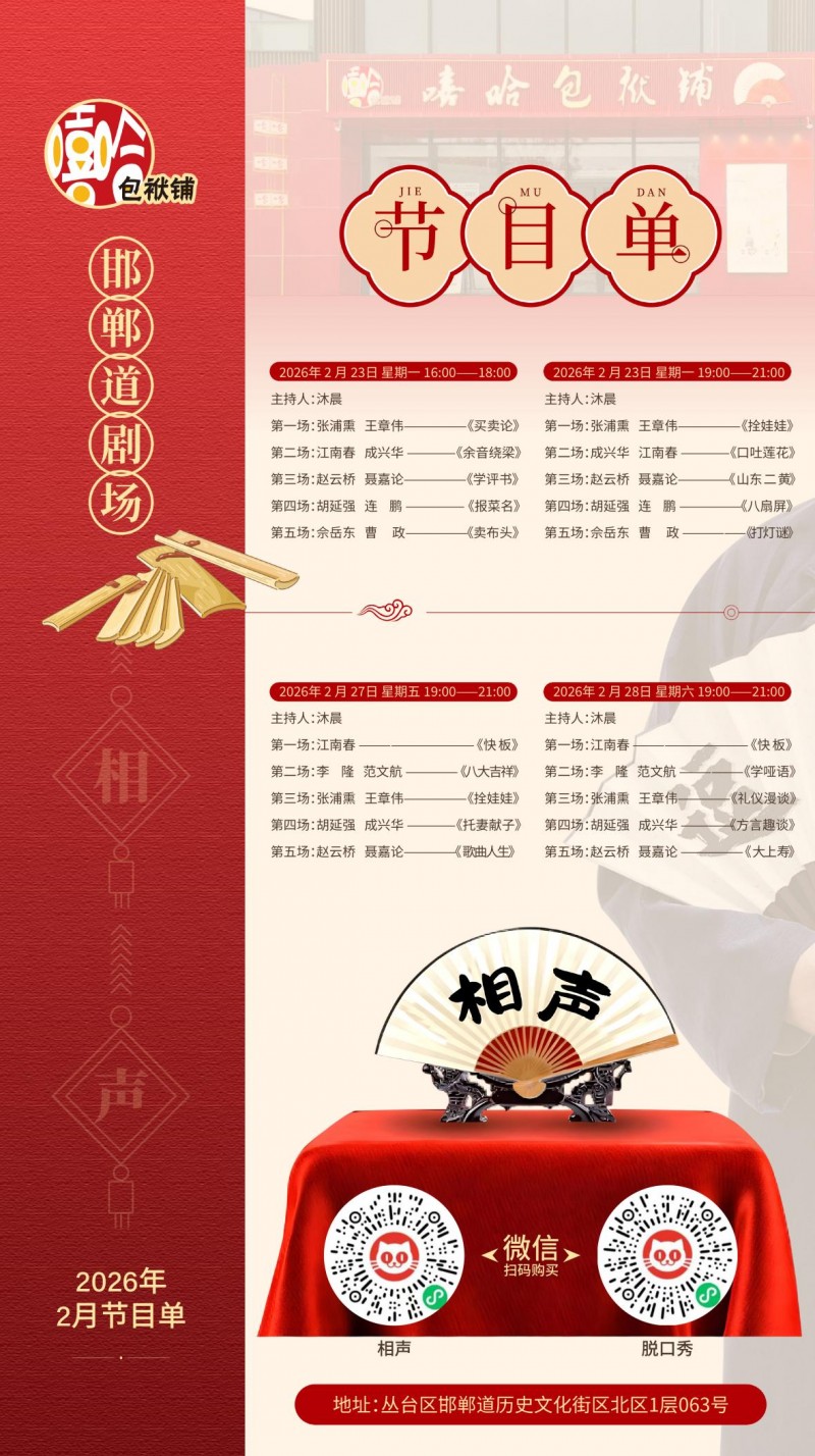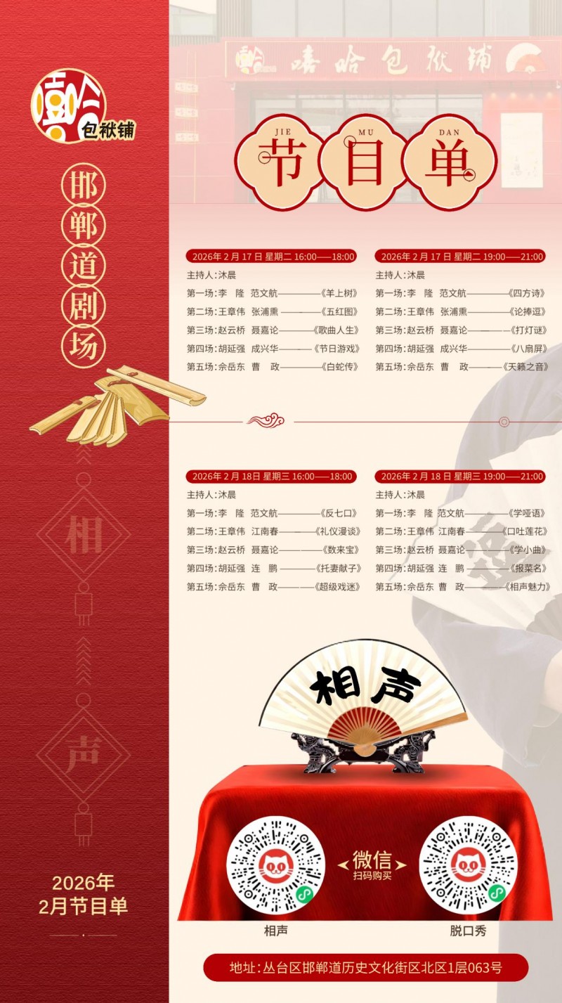 嘻哈包袱鋪邯鄲道劇場新春專場正式啟售,正月初一至初七每日開演,兩場黃金場次任選,這個春節(jié),拒絕平淡,告別無聊,讓相聲承包全家的歡樂,讓笑聲填滿每一段團圓時光。